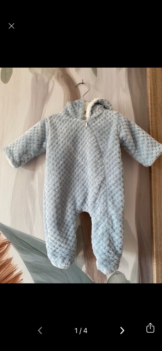 Yumuşak ve sıcak kumaştan yapılmış gri peluş bebek tulumu, kapüşonlu ve tam kapalıdır.