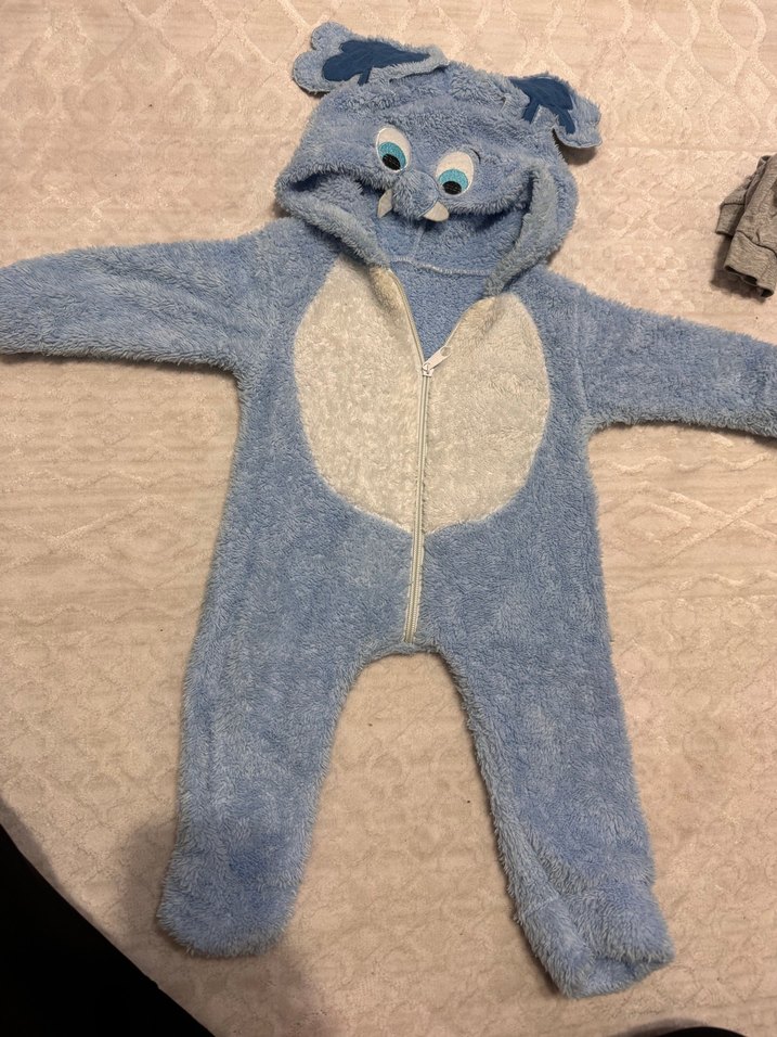 Gri renkte, yumuşak ve sıcak dokulu örgü bebek tulumu. Kapüşonunda sevimli kulaklar ve gözler bulunur, önünde kolay giyimi sağlayan fermuar vardır.