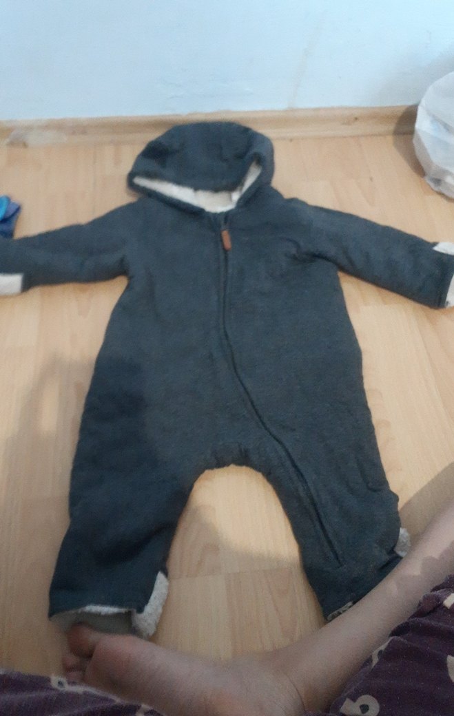 Kapüşonlu ve fermuarlı, yumuşak ve sıcak dokulu gri örgü bebek tulumu. Desensiz ve rahat kullanıma uygun.