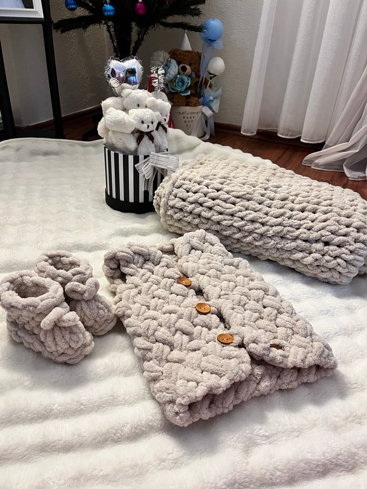 Gri örgüden yapılmış, düğmeli yelek, kalın battaniye ve uyumlu patiklerden oluşan yumuşak ve rahat bebek uyku seti.