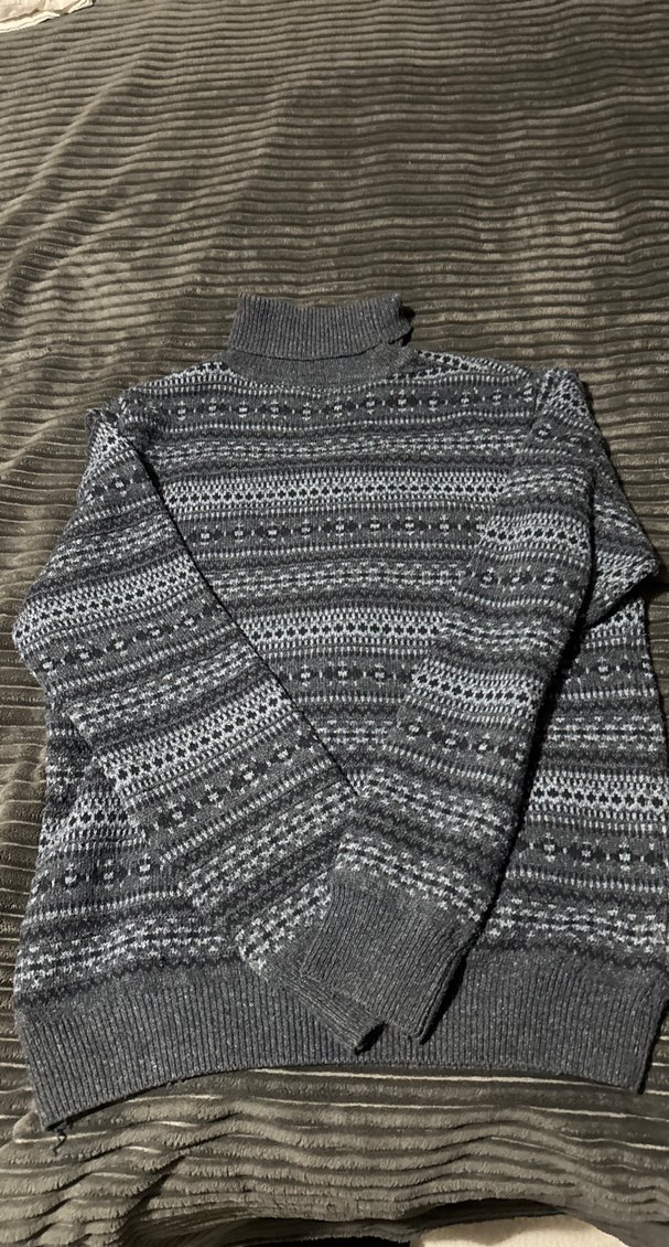 Gri renkli, desenli örgü erkek kazak, boğazlı ve uzun kolludur. Rahat kesim ve normal boyda, günlük sokak stiline uygundur.