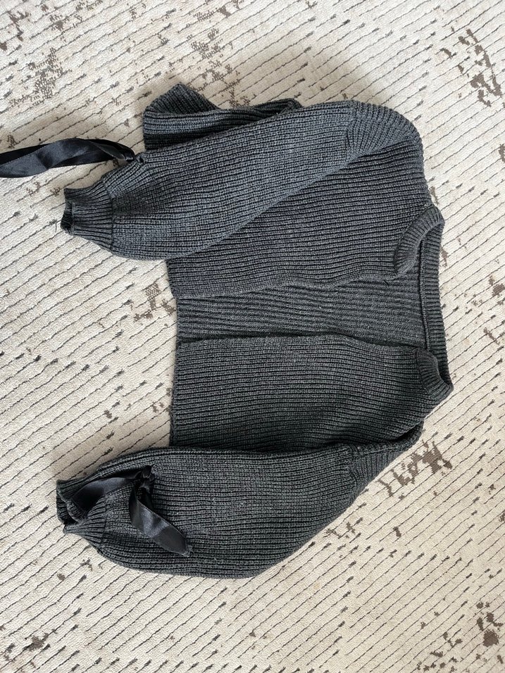 Gri örgü kumaştan yapılmış, bol kesim kadın ceket , bağcıklı kollarıyla rahat ve günlük tarzda şık bir seçimdir.