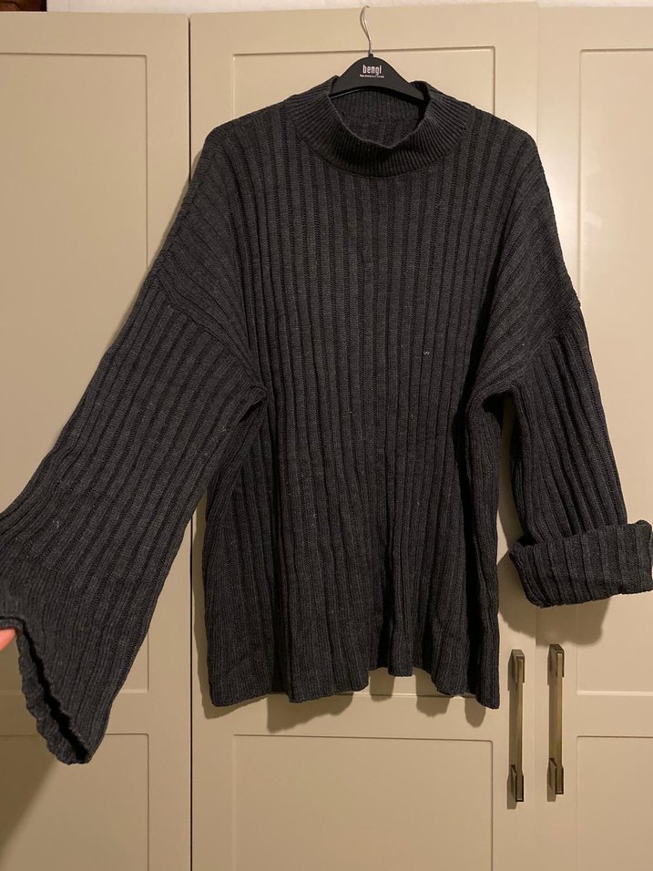 Gri renkte, yumuşak yünden örülmüş boğazlı, uzun kollu ve bol kesim normal midi uzunluğunda kazak. Sade ve rahat tasarımı günlük kullanım için uygundur. Standart beden.