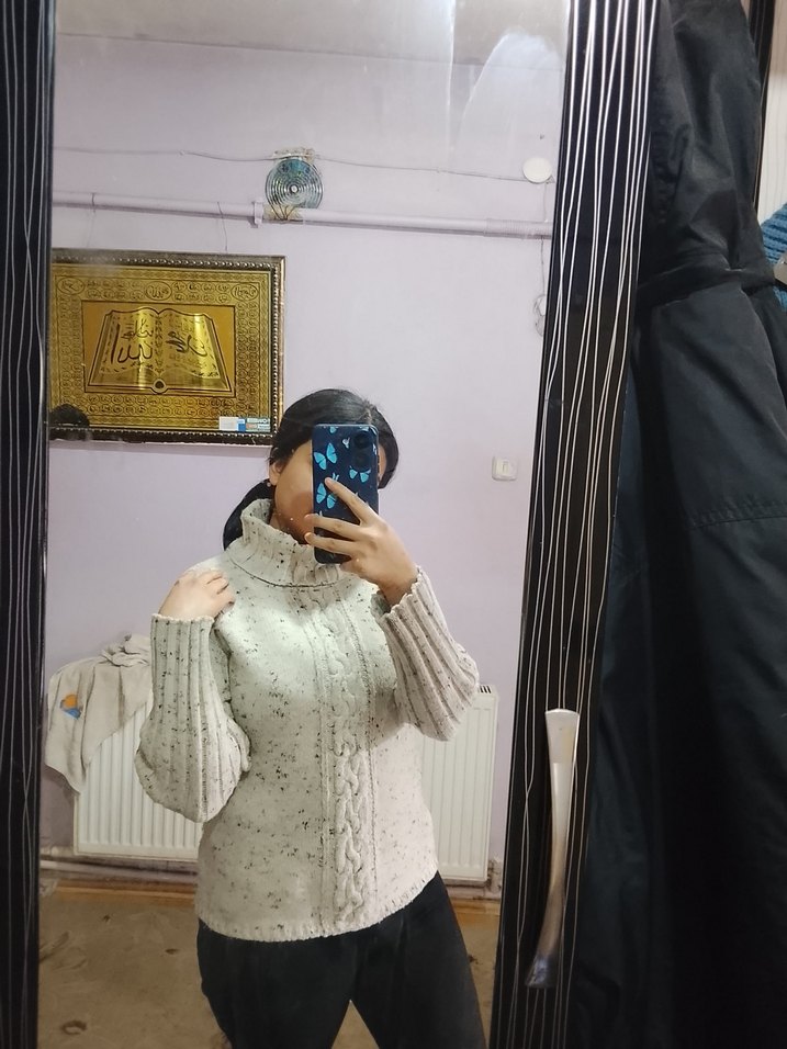 Gri renkli, örgü kumaştan, boğazlı ve uzun kollu, bol kesim kadın kazak. Günlük kullanıma uygun, desensiz ve rahat bir model. tertemiz bir iki kere anca giyildi çok sıcak tutuyor . L bedendir. ben 65 kg boyum 165 cm bana rahatlıkla oluyor