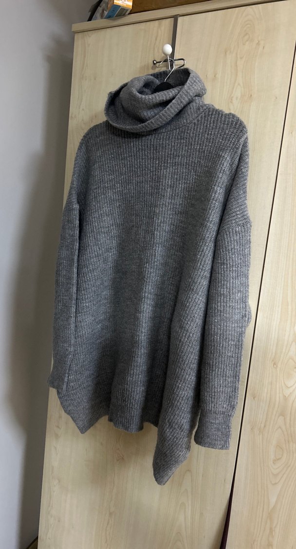 Gri renkli, örgü kumaştan yapılmış, boğazlı, uzun kollu ve bol kesim kadın kazak. Midi boyu ve desensiz yapısıyla rahat bir görünüm sunar.
