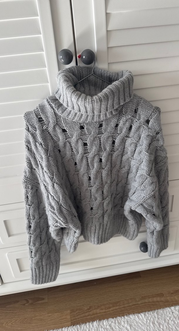 Gri renkli, örgü boğazlı kadın kazak, bol kesim ve uzun kolludur. Rahat ve günlük kullanıma uygundur.