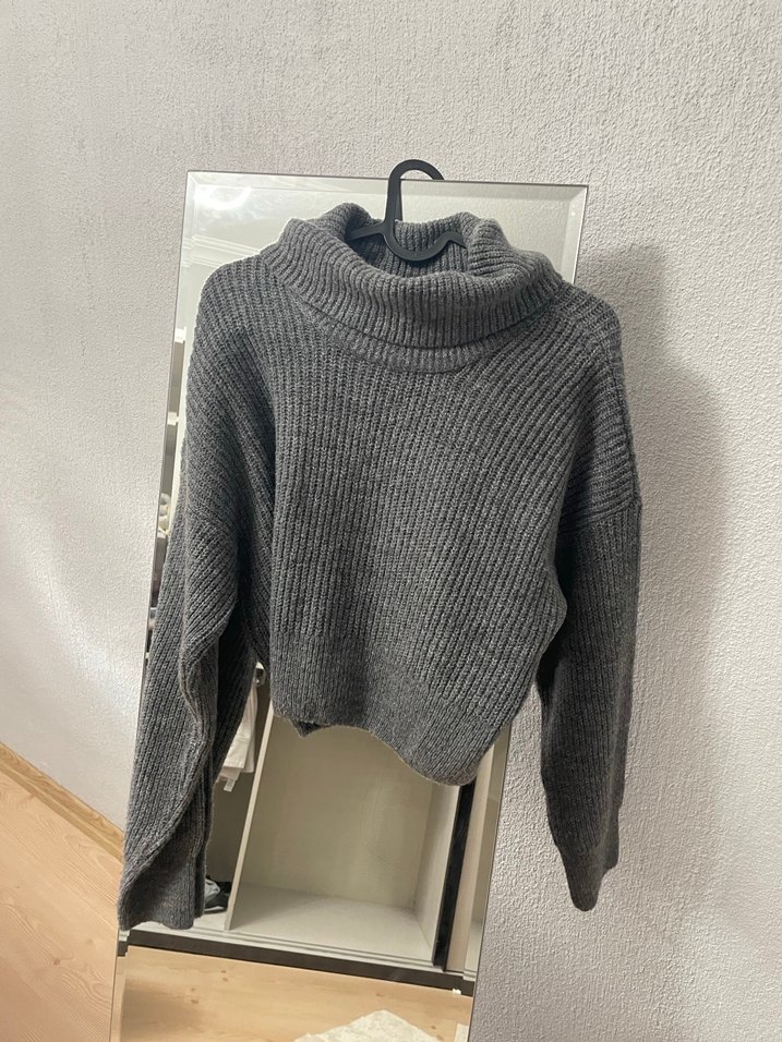 Gri örgü, yün kumaştan, boğazlı ve uzun kollu kadın kazak. Rahat kesimi ve crop boyu ile sokak stiline uygun. Desensiz ve sıcak tutar.