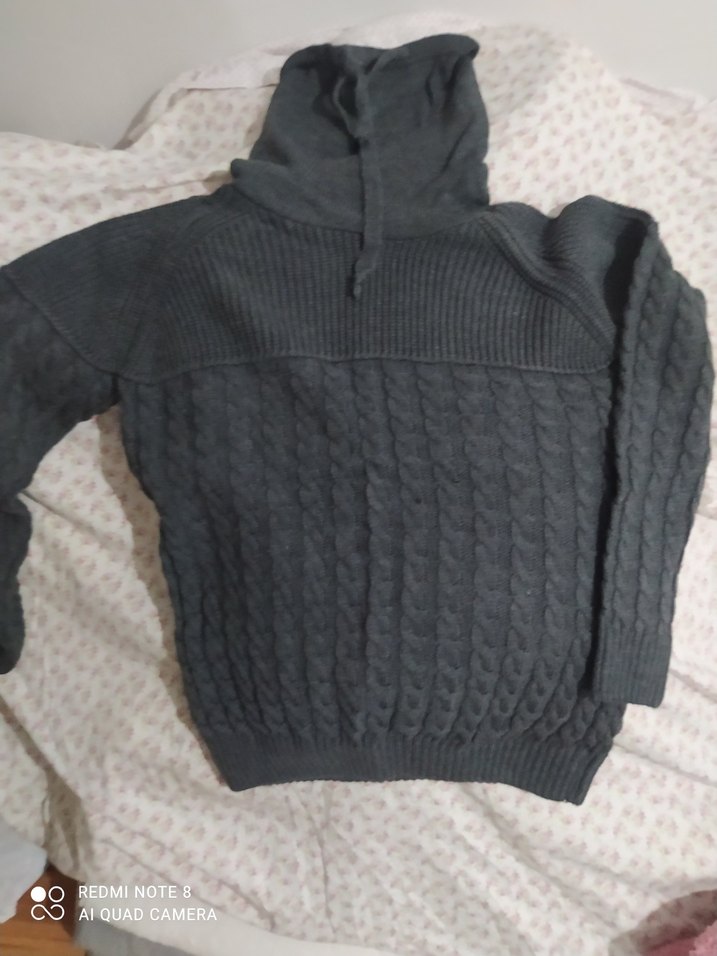 Gri renkli, örgü dokulu, boğazlı ve uzun kollu kadın kazak. Rahat kesimiyle günlük ve sokak stiline uygundur.