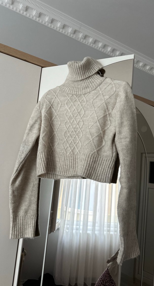 Gri örgü boğazlı, fitted kesim midi uzunlukta ve uzun kollu kadın kazak, rahat ve gündelik tarz sunar.