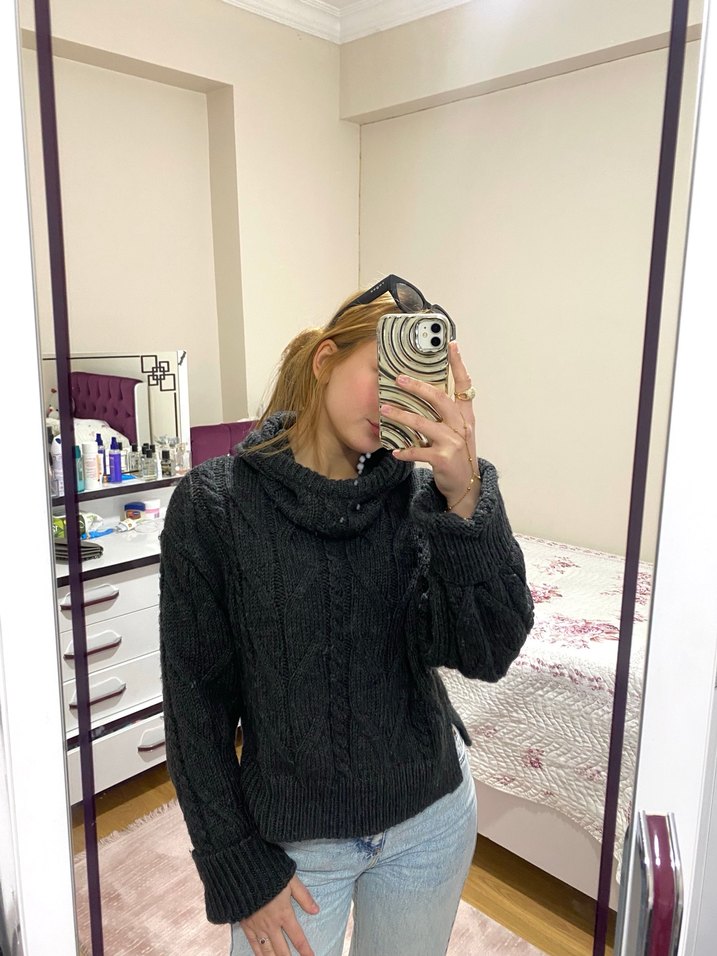 Gri örgü, boğazlı, uzun kollu, bol kesim kadın kazak. Bağlama desenli, midi boyda, günlük sokak modasına uygun. İki kez giydim geçen sene almıştım