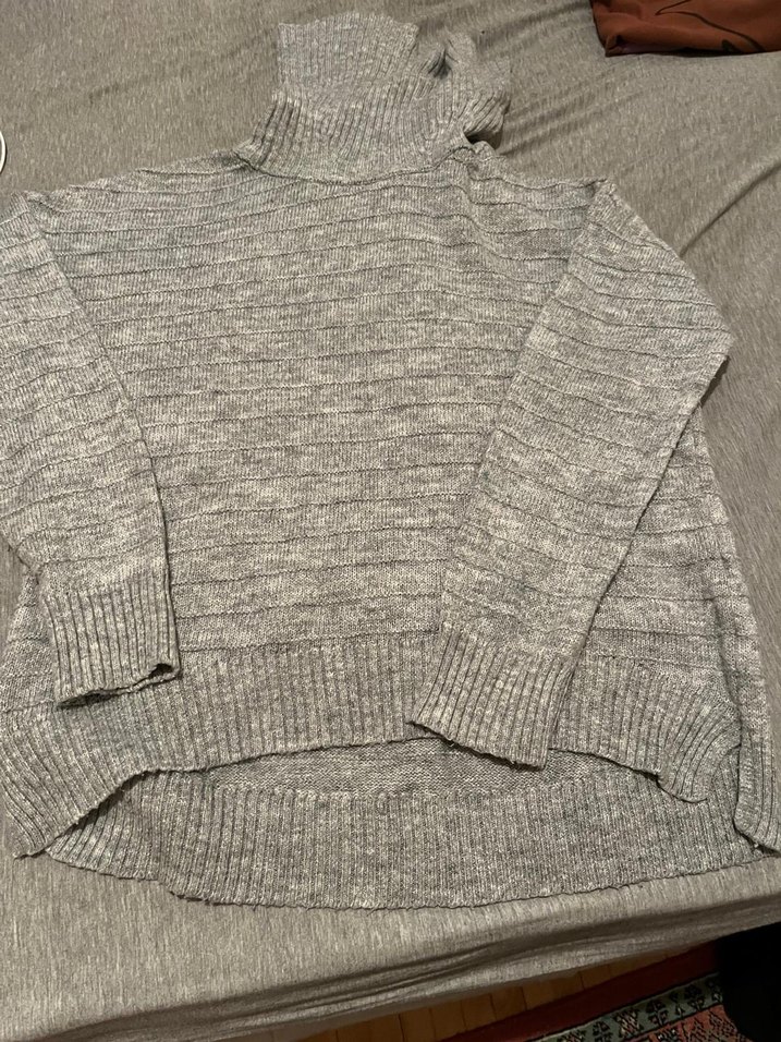 Gri renkli, yumuşak yün örgü kadın kazak. Boğazlı, uzun kollu ve rahat kesimle günlük kullanıma uygundur.