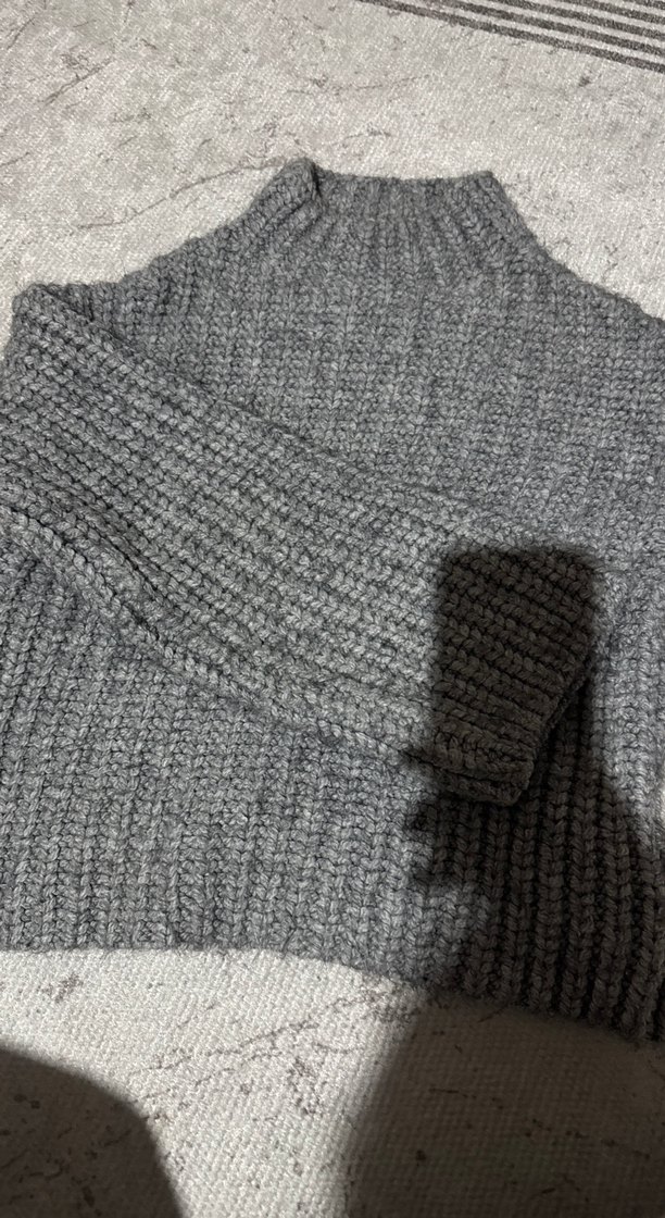 Gri renkli, örgü kumaştan yapılmış kadın kazak, boğazlı yaka ve uzun kolludur. Düz kesimi ve midi boyuyla rahat kullanım sağlar.