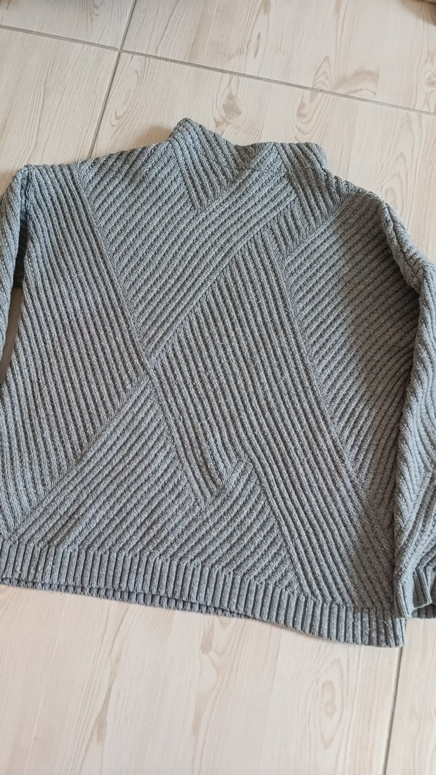 Gri örgü boğazlı kadın kazak, uzun kollu ve bol kesimdir. Normal boyda, sade ve rahat tasarımıyla günlük kullanıma uygundur.