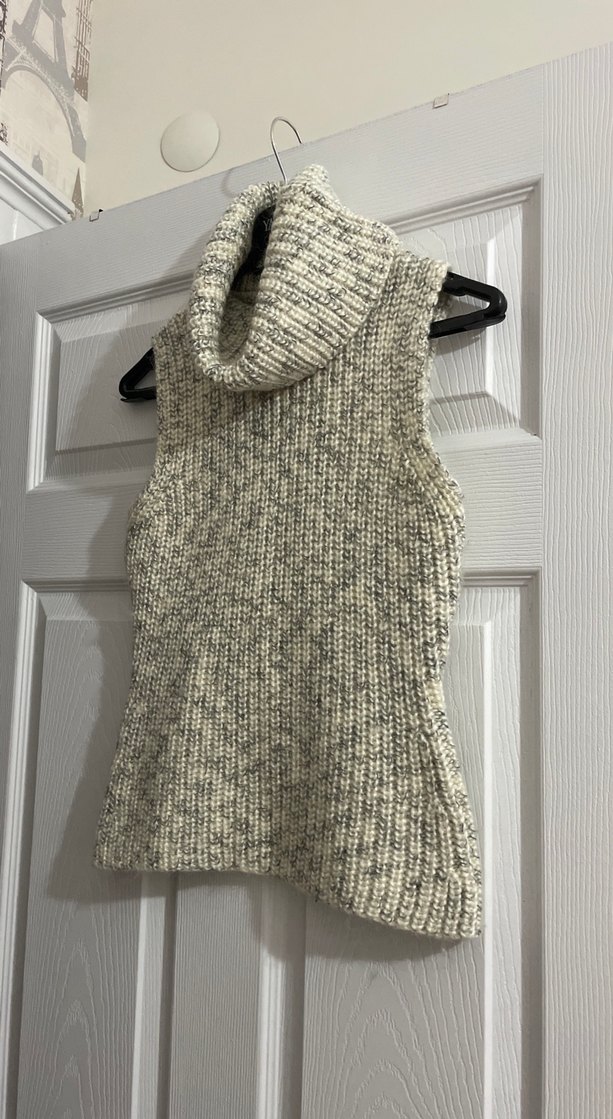 Yumuşak yünden, boğazlı ve kolsuz, gri örgü yapıda, vücuda oturan kadın kazak.