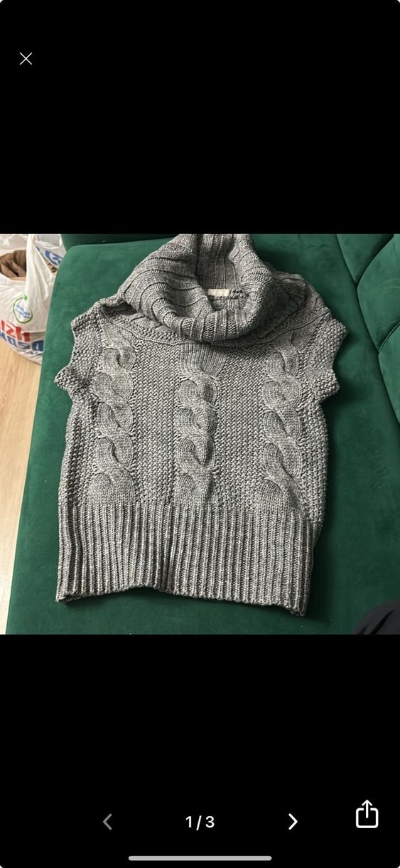 Gri renkli, örgü dokulu, boğazlı ve kolsuz kadın kazak. Normal midi boyda, vücuda oturan kesime sahiptir. Günlük rahat sokak stili için uygundur.