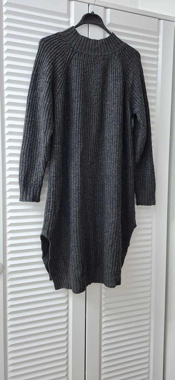 Gri renkli, örgü kumaştan yapılmış boğazlı, uzun kollu, bol ve uzun kesim kadın kazak.