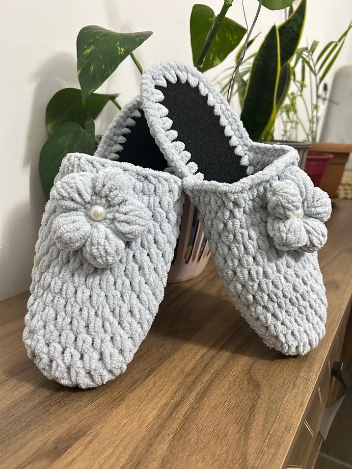 Gri örgü kadın ev terliği, çiçekli desene ve bohem stile sahiptir. Yumuşak dokulu, günlük kullanıma uygun terliktir. 37/38 ayak numarası aralığındadır.