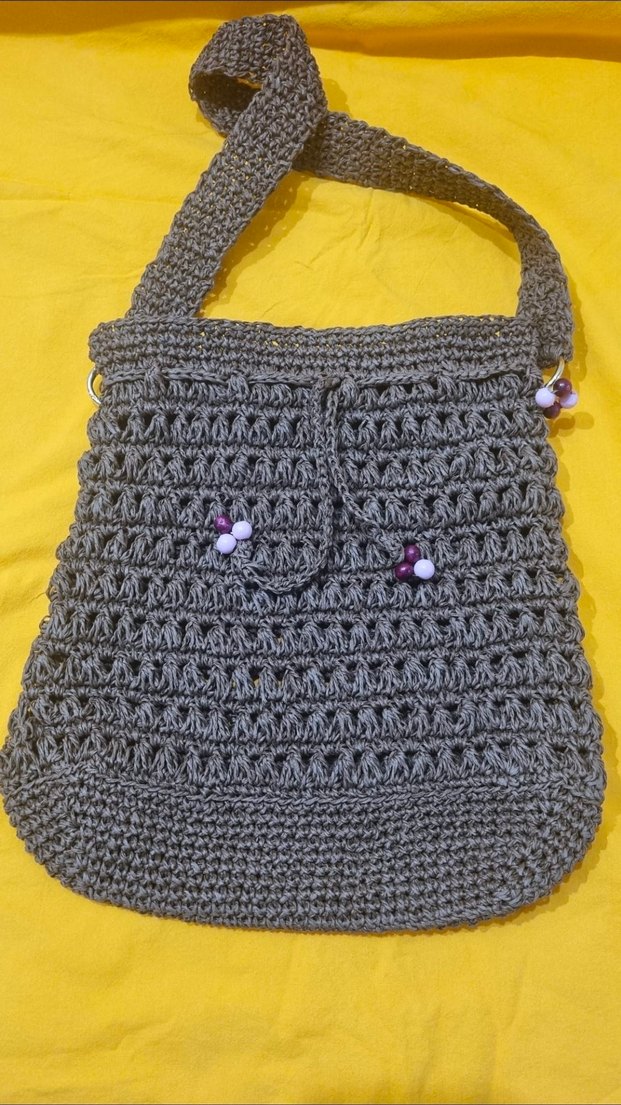 Gri renkli, örgü dokuma bohem tarzda kadın çantası. Tek askılı ve süslemeli boncuklu, günlük kullanım için uygun.