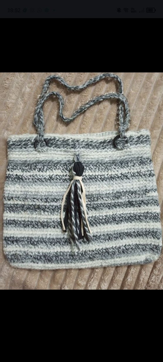 Gri örgü kumaştan yapılmış, zebra desenli bohem tarzda kadın çantası. Örgü sapları ve püskül detayıyla günlük kullanıma uygun.