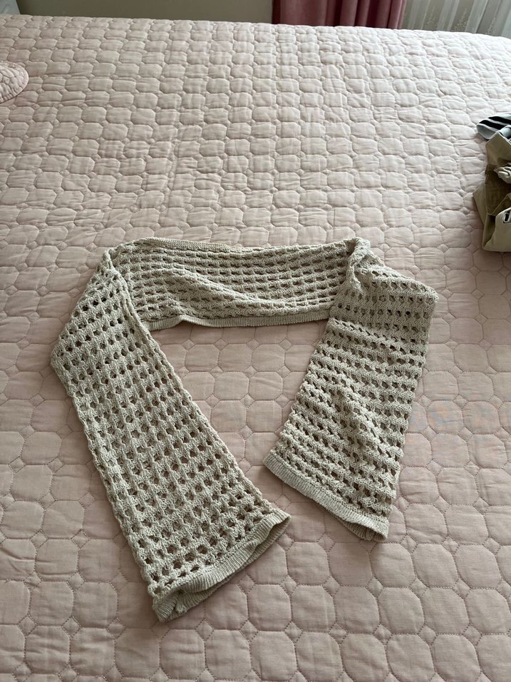 Gri renkli, örgü dokulu ve açık örgü deseniyle bohem tarzı yansıtan, rahat bir kadın üstü.