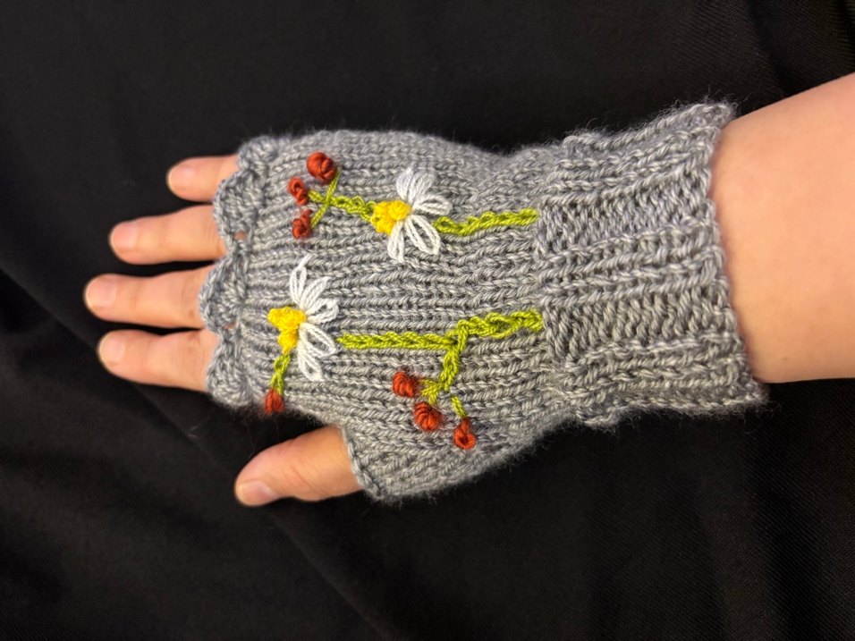 Renkli çiçek işlemeli, gri örgü bohem tarzda kadın eldiveni, rahat ve retro bir görünüm sunar.