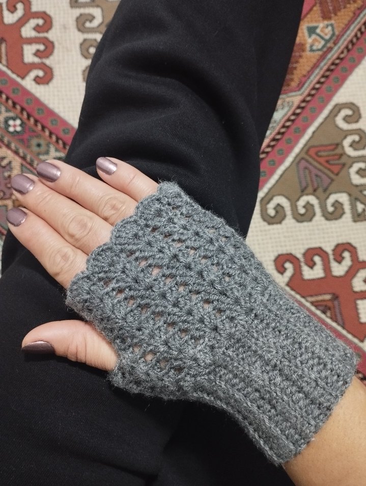 Gri örgü, bohem tarzda kadın eldiveni. Parmaksız, rahat ve sıcak tutan detaylı örme desene sahip.