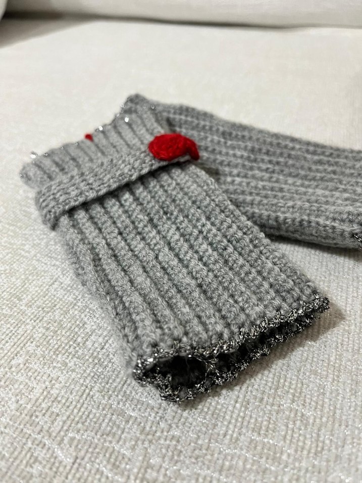Gri örgü eldivenler, yumuşak ve sıcak dokusuyla rahat bir bohem tarz sunar. Kırmızı düğme detayıyla nostaljik bir hava katar.