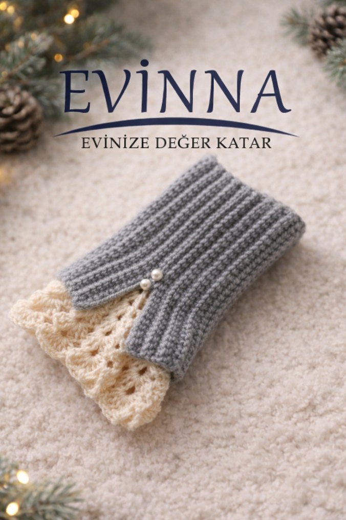 Gri örgü bohem tarzda kadın eldiveni, dantel ve inci detaylarıyla sıcaklık ve şıklık sağlar. EVINNA markalıdır.