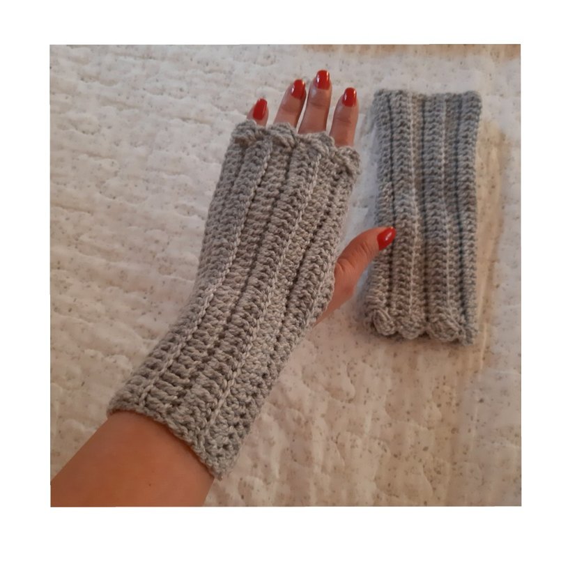 Gri renkli, örgü dokulu ve parmakları açık bohem tarzda kadın eldivenleri. Yumuşak ve rahat yapısıyla retro ve hippie görünüme uygundur.