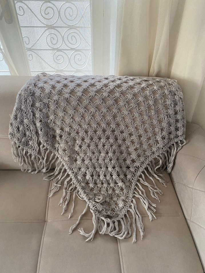 Gri renkli, örgü dokulu kadın şalı, bohem tarzıyla rahat ve şık. Uçlarında püsküller bulunur, retro ve hippie stillerine uygundur.
