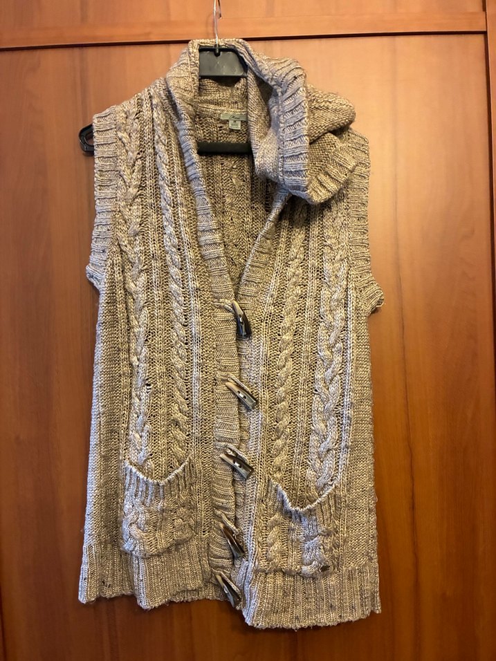 Gri renkte örgü, kolsuz, yüksek yakalı, bohem tarzda, düğmeli ve rahat kesimli kadın süveter. Günlük kullanıma uygun.
