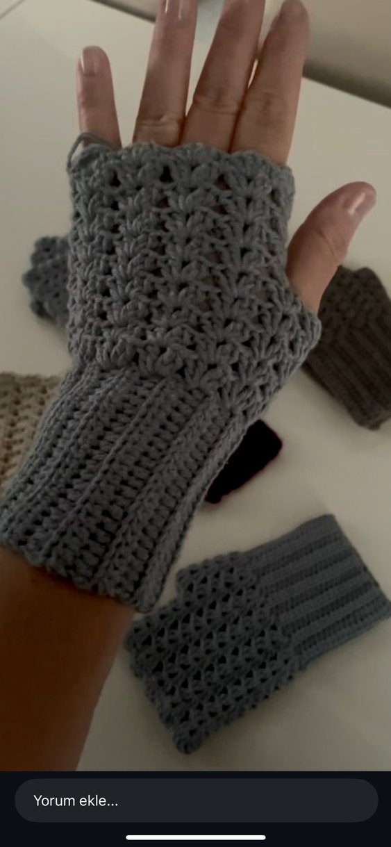 Gri renkte, bohem tarzda örülmüş parmaksız eldivenler. Sıcak tutar ve hareket özgürlüğü sağlar. İstediğiniz renkte örülür