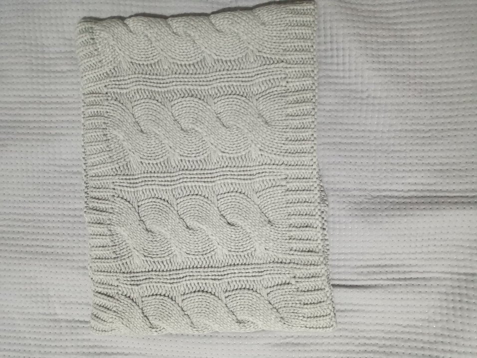 Gri renkli, örgü kumaştan çocuk battaniyesi, kablo örgü deseniyle sıcaklık ve konfor sağlar.