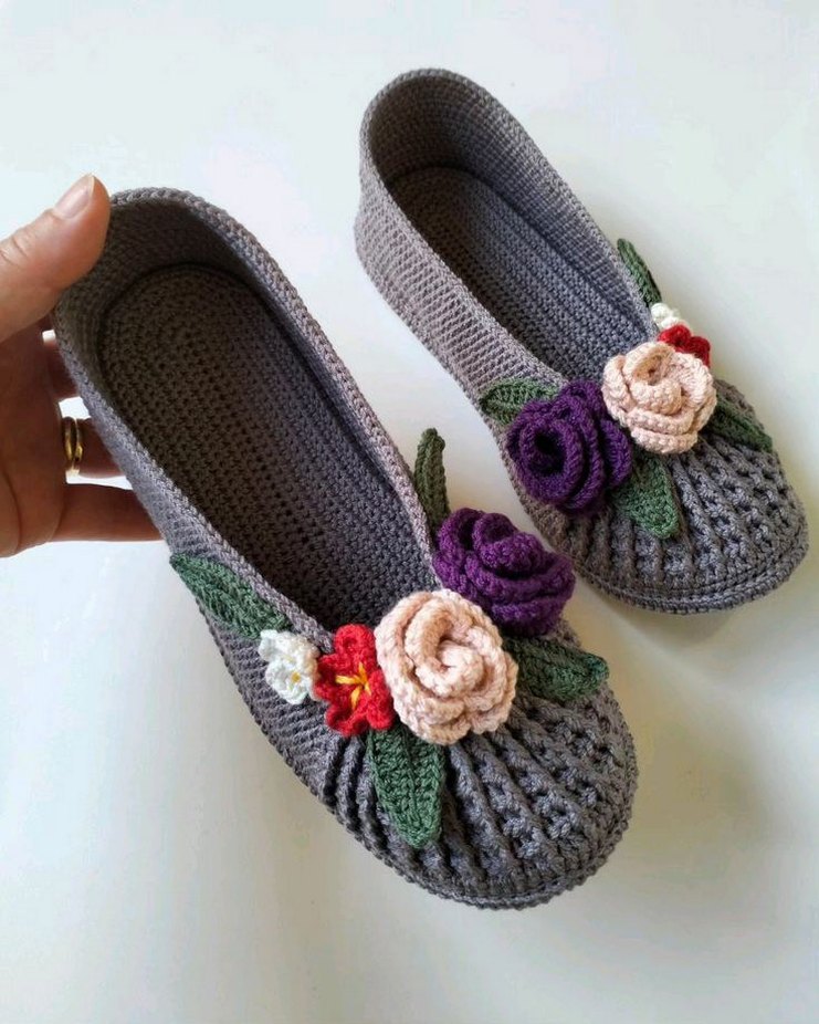 Gri örgü kumaştan yapılmış, çiçekli örgü detaylara sahip bohem tarzda kadın terlik, ince topuklu ve günlük kullanıma uygun.