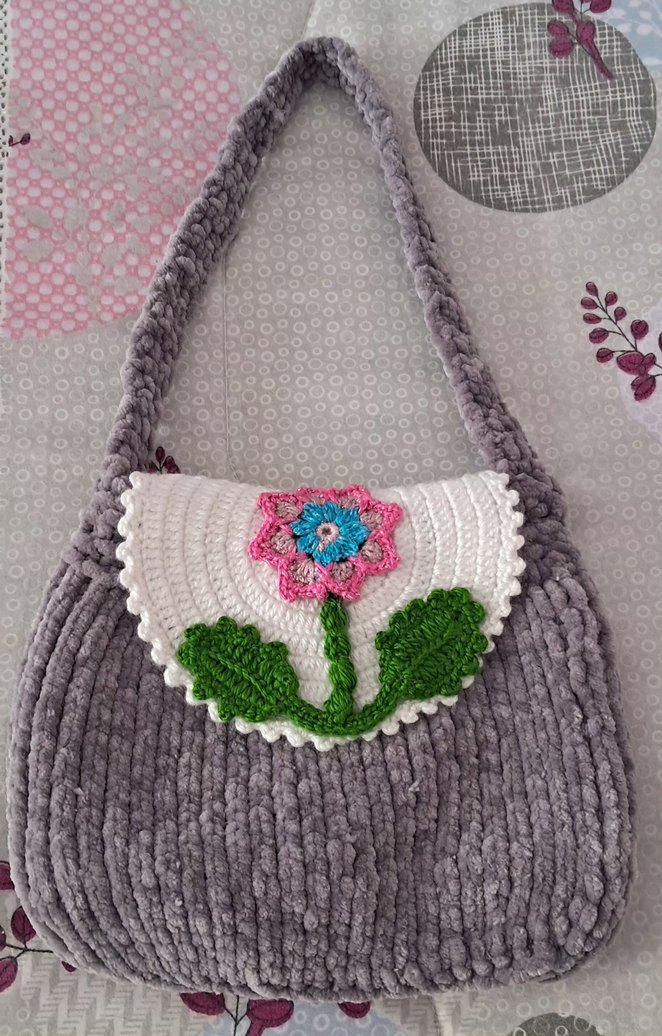 Gri örgü dokusuyla bohem tarzda, çiçek desenli kapaklı kız çantası. Rahat ve renkli detaylarıyla retro, hippie havası verir.