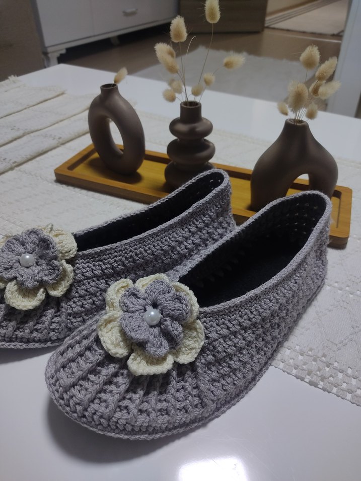 Gri Örgü Çiçekli Kadın Ev Terliği