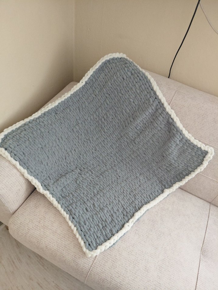 Gri renkli, örgü kumaştan yapılmış, desensiz ve beyaz bordürlü çocuk battaniyesi. Sıcak ve rahat bir kullanım sunar.