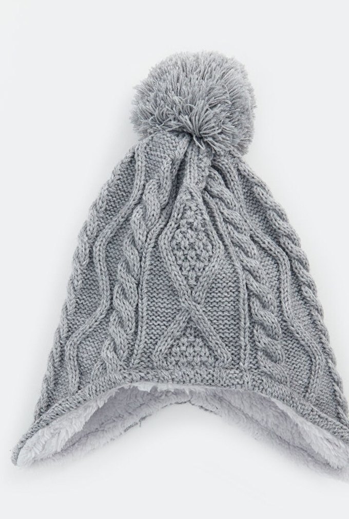 Gri renkli örgü çocuk bere, ponponlu ve yumuşak iç astarlı rahat bir tasarıma sahiptir, bohem tarzına uygundur. ❄️
