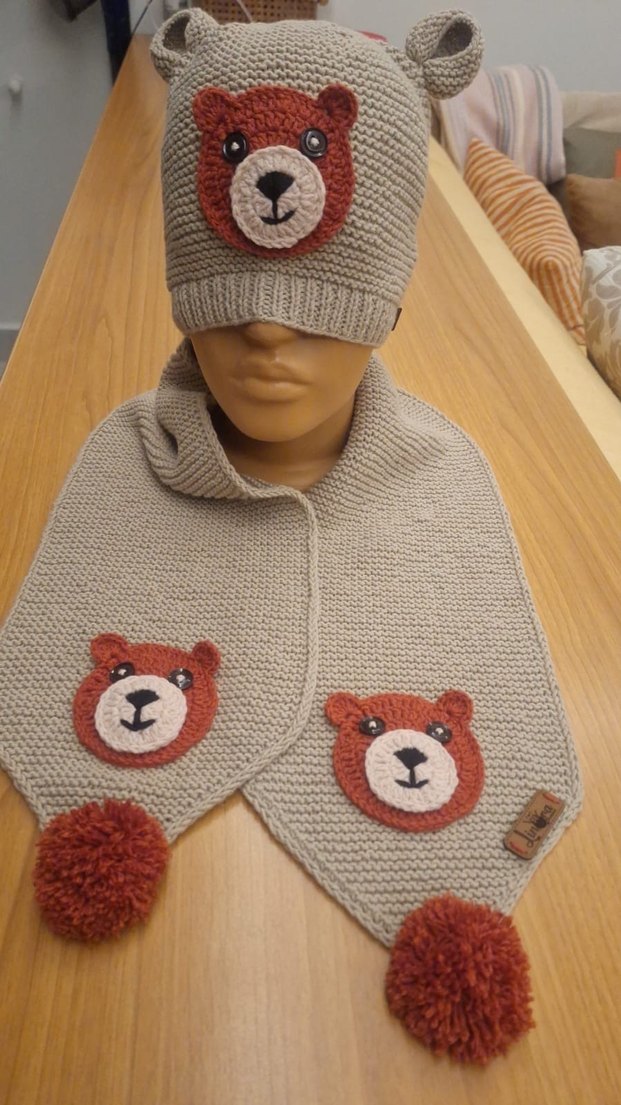 Gri renkli, örgü çocuk bere ve atkı seti, işlemeli ayı yüzleri ve ponpon detaylarıyla bohem ve retro tarzını yansıtıyor.