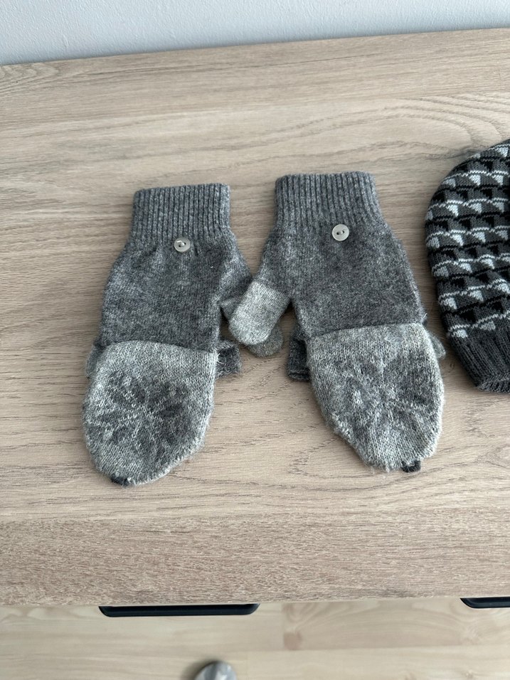 Gri renkli, düğmeli katlanabilir örgü eldiven Sıcak tutan ve bohem tarzı yansıtan bir tasarım. Şapka eldiven takım.