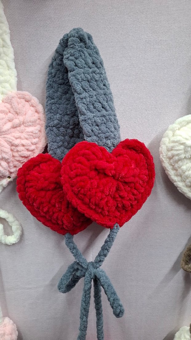 Gri örgü malzemeden yapılmış, kırmızı kalp kulak kapaklı ve bağcıklı çocuk bere, bohem tarzda sıcaklık sağlar. ❤️