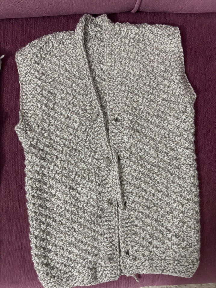 Gri örgü çocukyelek, V yakalı ve bol kesimlidir. Desensiz, rahat ve kolsuz tasarımıyla günlük kullanıma uygundur.