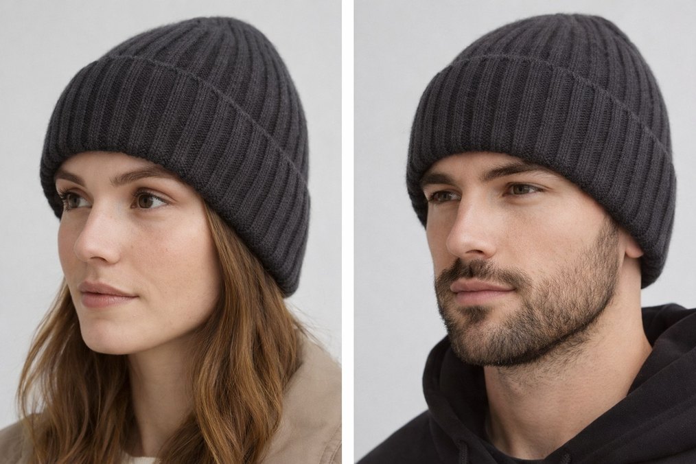 Gri örgü yünden yapılmış kadın bere, rahat ve sade bir tarza uygun, temel ve karşı kültür stilinde.