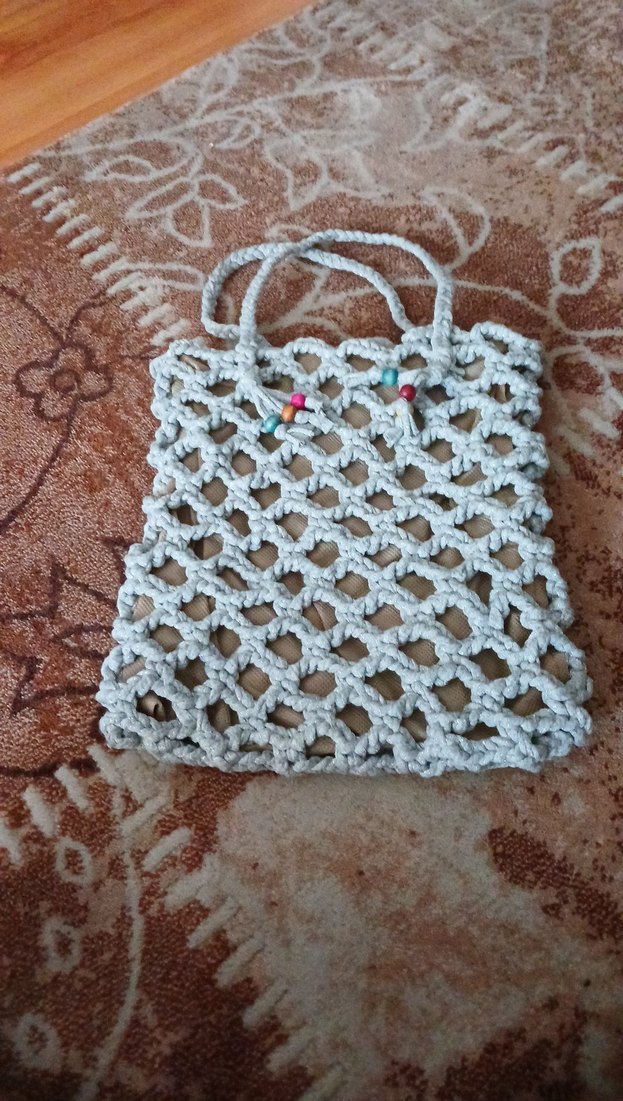 Gri örgü kumaştan yapılmış, dantel detaylı, rahat ve desen içermeyen bohem tarzda kadın çantası. Günlük kullanıma uygun.