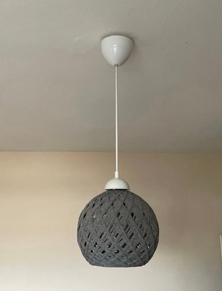 Gri örgü desenli sarkıt lamba, küresel gövdesiyle dokulu bir ışık efekti sunar. Beyaz tavan aparatıyla asılır. Hiç bir sorunu yok marka temsili