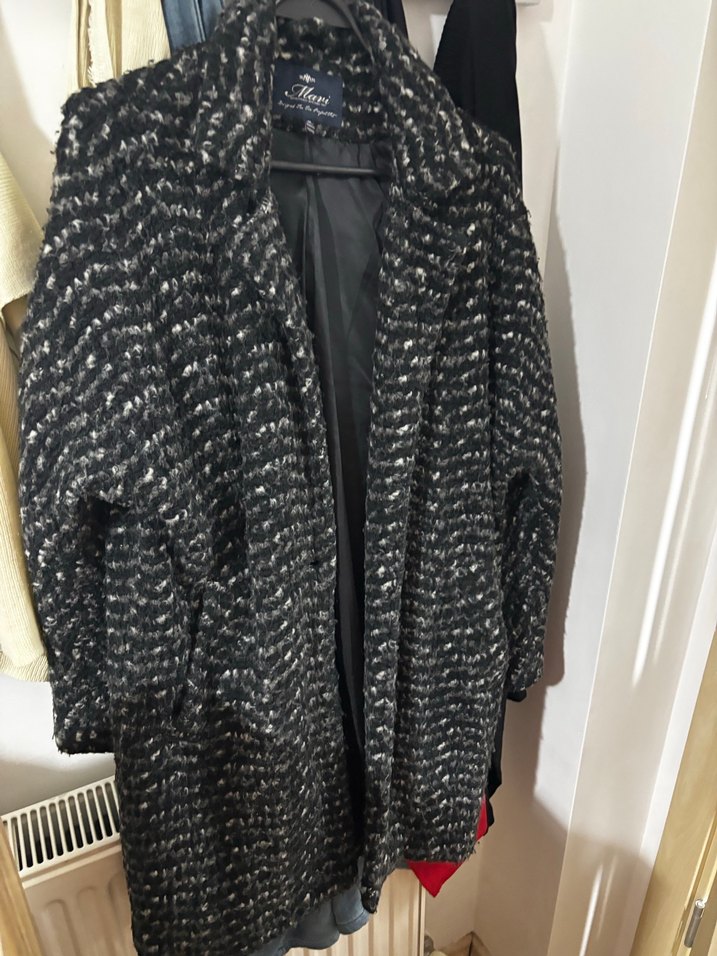 Gri örgü desenli kaban, notalı yaka ve bol kesim, uzun kollu, günlük sokak stili için uygun.