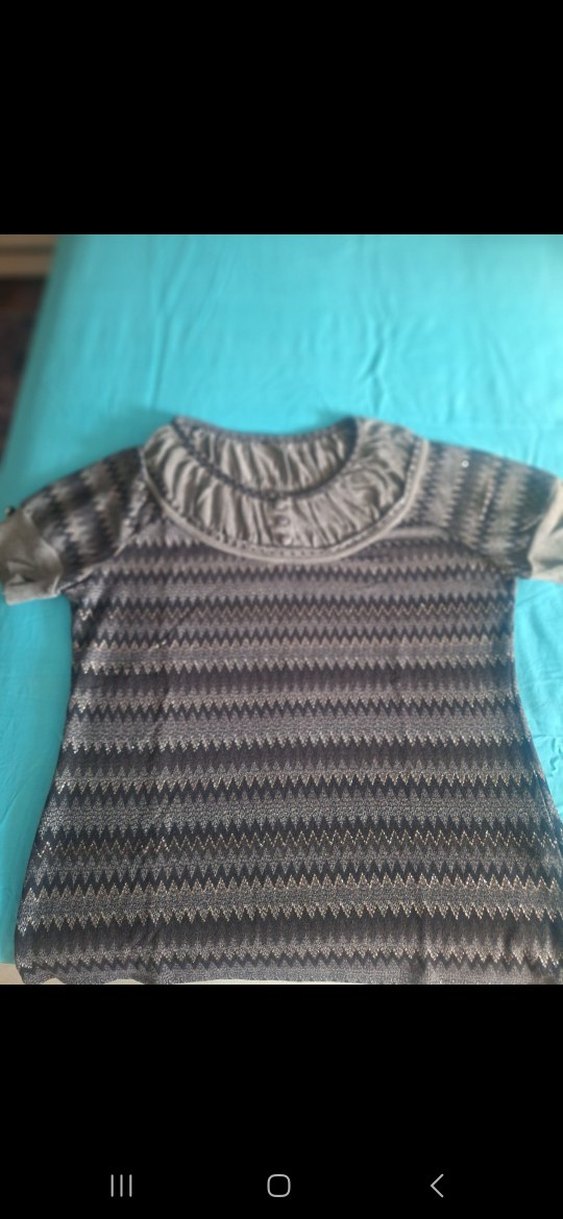 Gri tonlarında örgü detaylı, kısa kollu, tekne yaka ve normal boyda kadın bluz. Rahat ve şık gündelik sokak stili için uygundur.