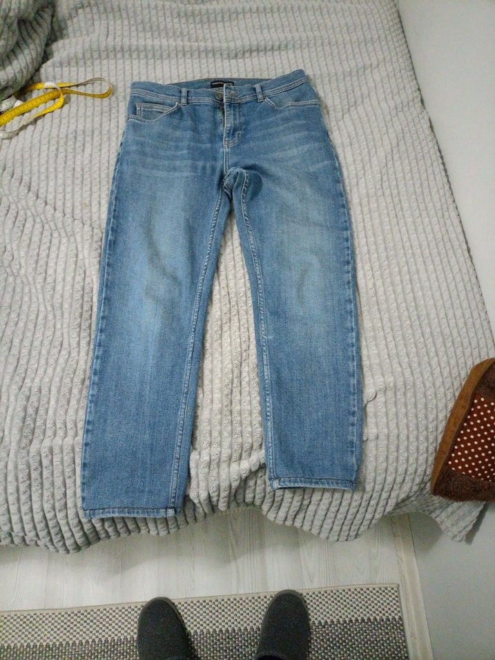 Bu mavi denim kot pantolon, bol kesim ve midi boy olup örgü detaylarıyla günlük rahat bir stil sunar.