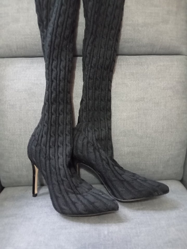 Gri örgü dokulu dizüstü çizme, stiletto topuklu, konforlu ve çağdaş tarzda klasik şıklık sunar. Ofis kullanımı için uygundur. 37 numara ama kalıp dar 36 olur değişim yapmıyorum boy 69 topuk boyu 10cm