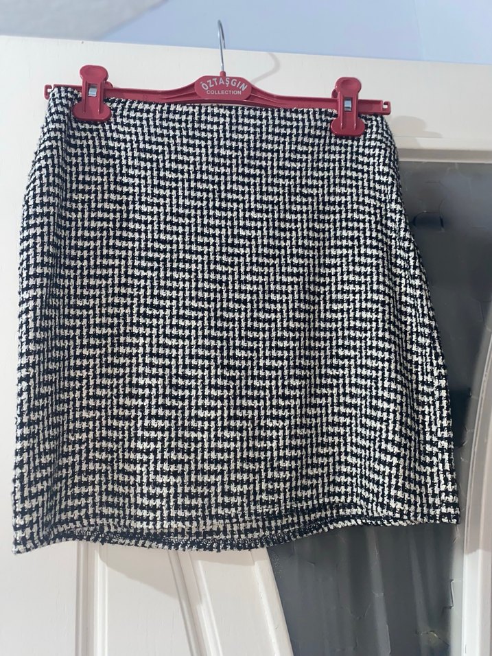 Bu fitted midi mini etek, koyu gri örgü dokulu tekstilden yapılmış, Paris sokak modası tarzında günlük kullanım için uygundur.